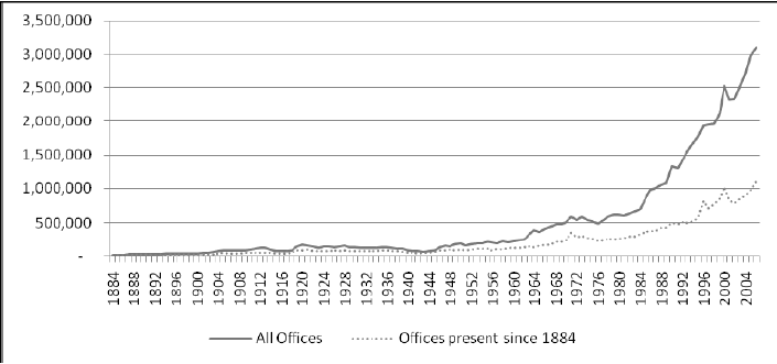 Il grafico, riportato da Ocean Tomo ed elaborato sulla base di un campione di 200 imprese quotate in tutto il mondo, mostra come negli ultimi 30 anni i beni intangibili hanno acquisito sempre maggior valore economico e strategico. Se negli anni '70 i beni intangibili rappresentavano circa il 20% del valore di mercato una impresa, oggi questi ne rappresentano circa l'80%. Gli intangibili rappresentano quindi un'ingente fetta del valore di mercato di un'azienda e sono un fattore critico di successo per molte imprese, costituendo un elemento differenziante nel processo di acquisto. A partire dagli anni '90 il divario tra valore di mercato e valore contabile di un'impresa, misurato dall'indice "price to book value", è notevolmente aumentato, segnalando che il mercato continua ad attribuire all'impresa un valore superiore a quello contabile, evidentemente per merito delle attività immateriali. Il seguente grafico mostra il numero di domande di deposito di marchi presentate presso tutti gli uffici specializzati nel mondo dal 1884. Come si può evincere dal grafico il numero di domande di deposito e aumentato vertiginosamente nell'ultimo trentennio.